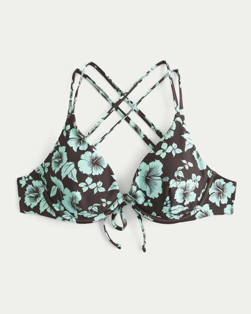 A cute underwire bikini top featuring an all-over floral pattern and strappy back. Removable padding, tie back.