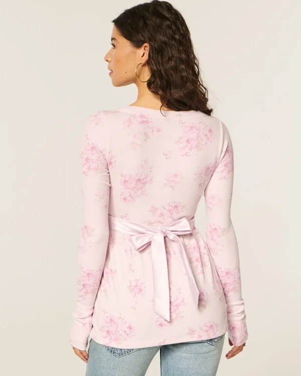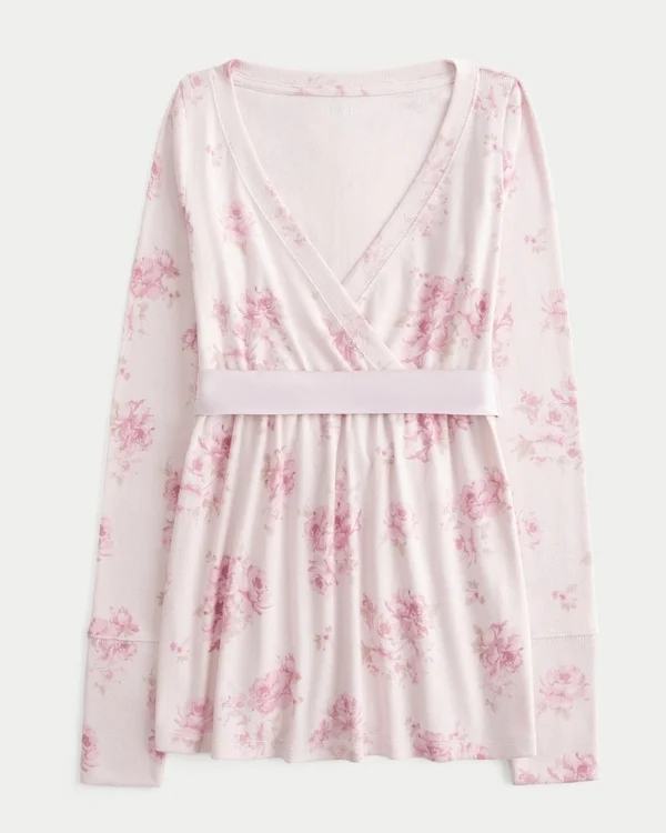 Cute and super soft, this long-sleeve babydoll top has a flowy hem and wrap-style v-neckline. Long sleeves, satin band at waist. Easy Fit.