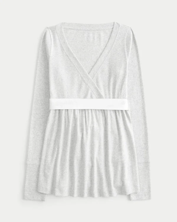 Cute and super soft, this long-sleeve babydoll top has a flowy hem and wrap-style v-neckline. Long sleeves, satin band at waist. Easy Fit.