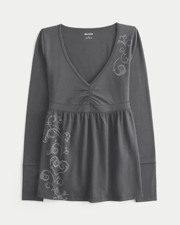 Super soft and comfy, this long-sleeve babydoll top features Y2K-inspired print graphics and a pinch bust detail. Flowy hem, v-neckline. Easy Fit.