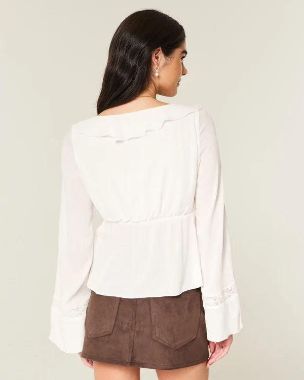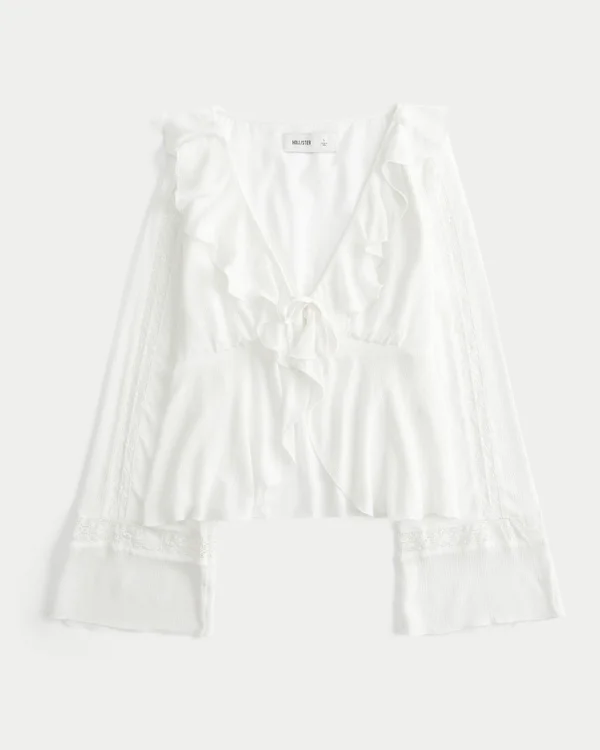 Flowy and super soft, this long-sleeve babydoll top features pretty ruffled trim along the neckline and a flyaway hem. Lace insets, center tie. Easy Fit.