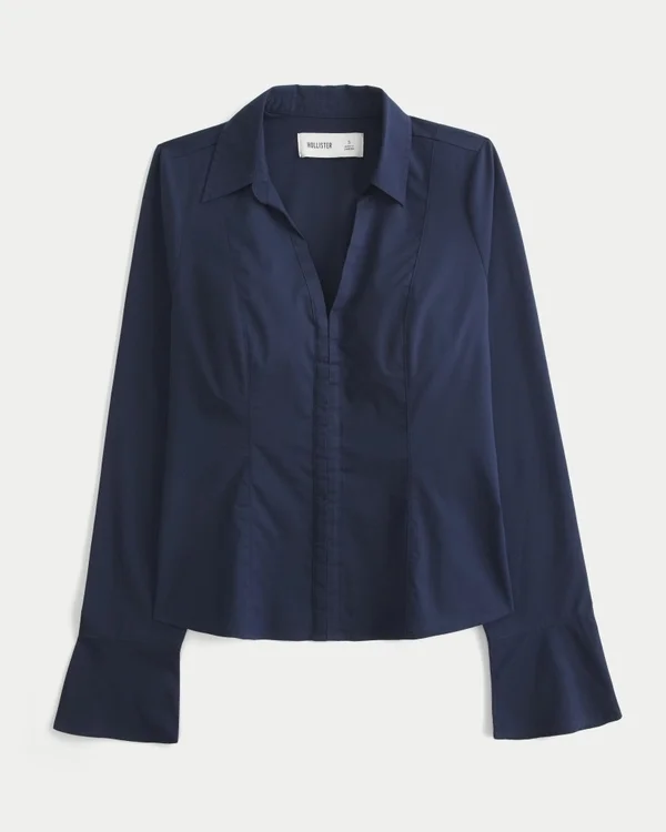 This classic long-sleeve shirt is made with stretch poplin shirt and features a full hook-and-eye closure and bell sleeves. Back tie, collar. Looks perfect dressed up or down! Slim