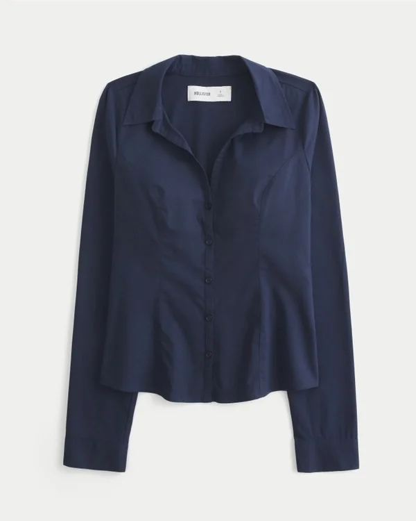 A Y2K-inspired long-sleeve stretch poplin shirt with a full button closure and seaming. Collar, adjustable back tie for the perfect fit. Looks perfect dressed up or down! Slim Fit.