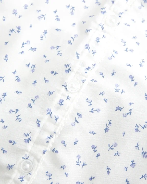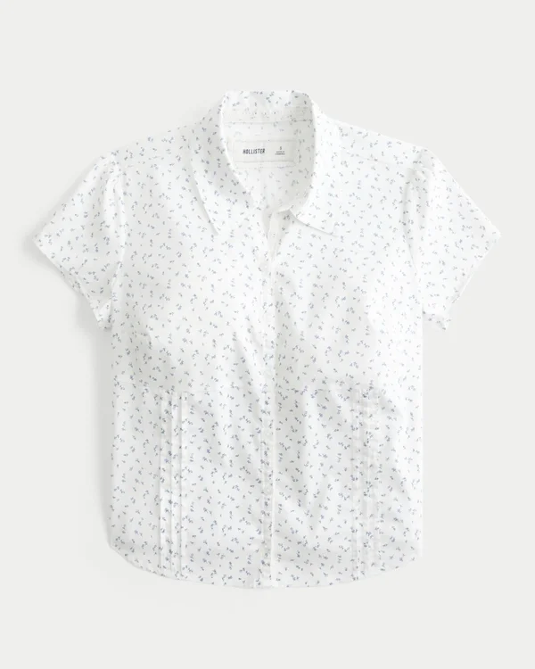 A Y2K-inspired short-sleeve button-through shirt in stretch poplin fabric, featuring pintuck pleats and interior lace detailing along the button closure. Back tie detail, looks per