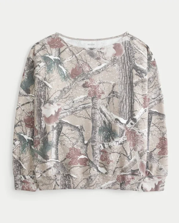 This super soft and comfy sweatshirt features an all-over camo pattern and off-the-shoulder neckline. Long sleeves. Oversized Fit.