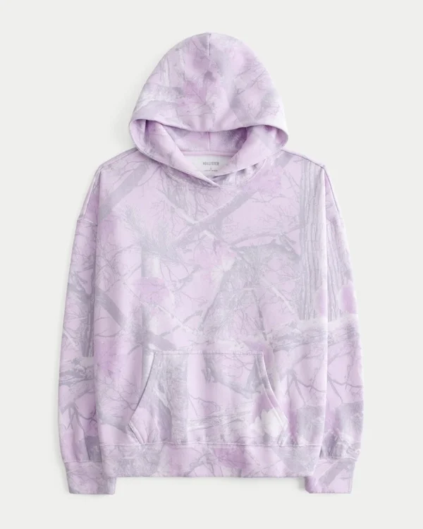 This super soft fleece hoodie features an all-over camo pattern. Front pouch pocket, long sleeves. Oversized Fit.