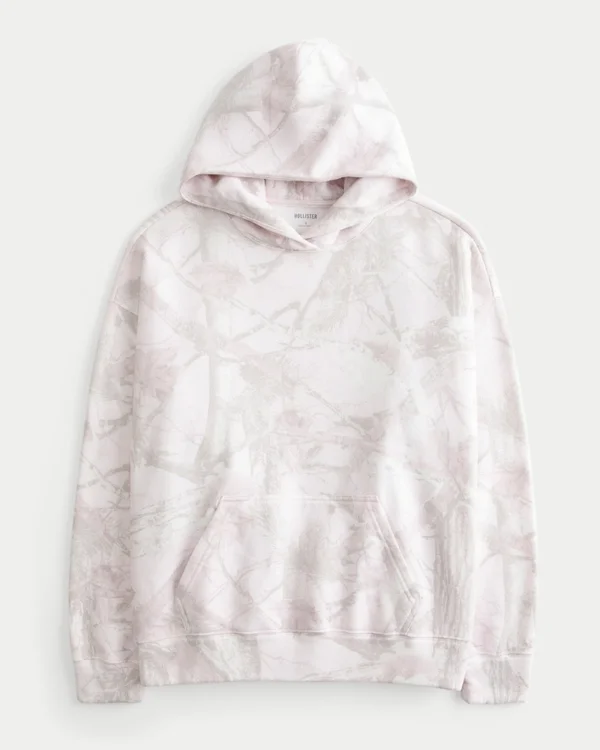 This super soft fleece hoodie features an all-over pink camo pattern. Hood, front pouch pocket, long sleeves. Oversized Fit.