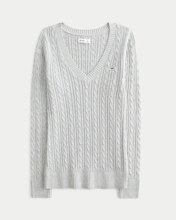 A super soft and cozy sweater with classic cable-knit patterns and an embroidered left chest logo icon. V-neckline, ribbed trims, longer length, long sleeves. Slim Fit.