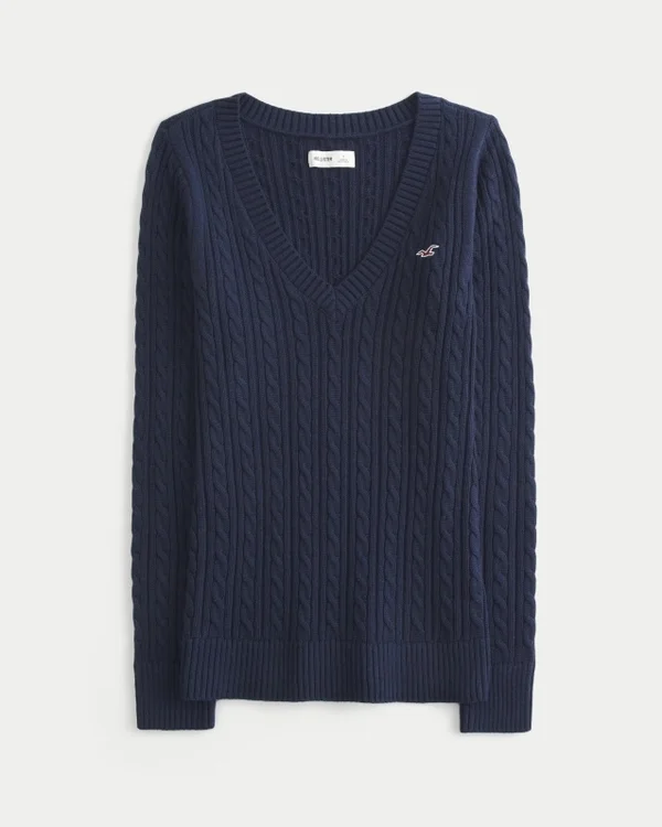 A super soft and cozy sweater with classic cable-knit patterns and an embroidered left chest logo icon. V-neckline, ribbed trims, longer length, long sleeves. Slim Fit.