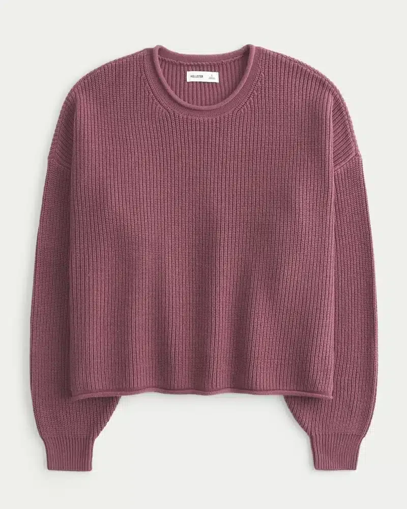 A cozy and super soft sweater with a rolled crew neckline and rolled hem. Long sleeves with ribbed hems. Easy Fit.