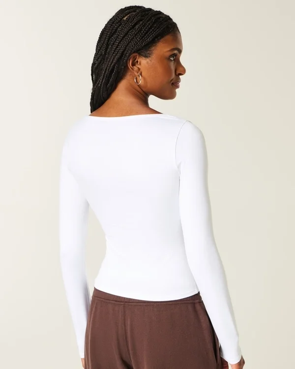 A cute and comfy baby tee in super soft fabric with a seamless look and feel. Square neckline, long sleeves. Slim Fit.